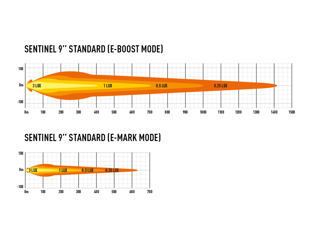 - 0.25lux: 1414 m / 632 m (Boost / E-hyväksytty)