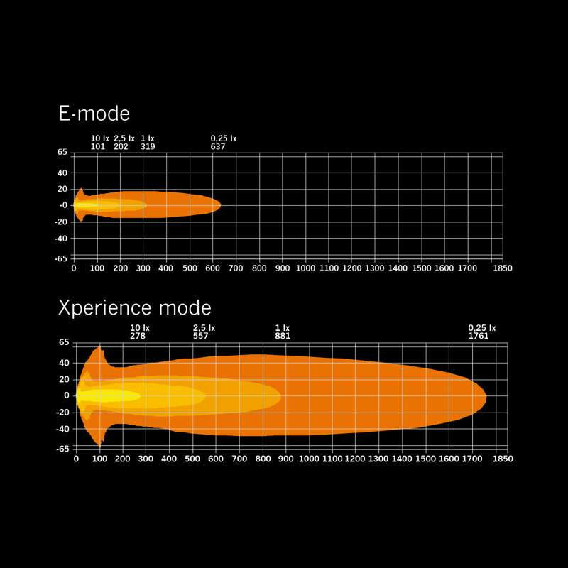- 1 lux @ E‑mode: 319 m / X‑mode: 881 m