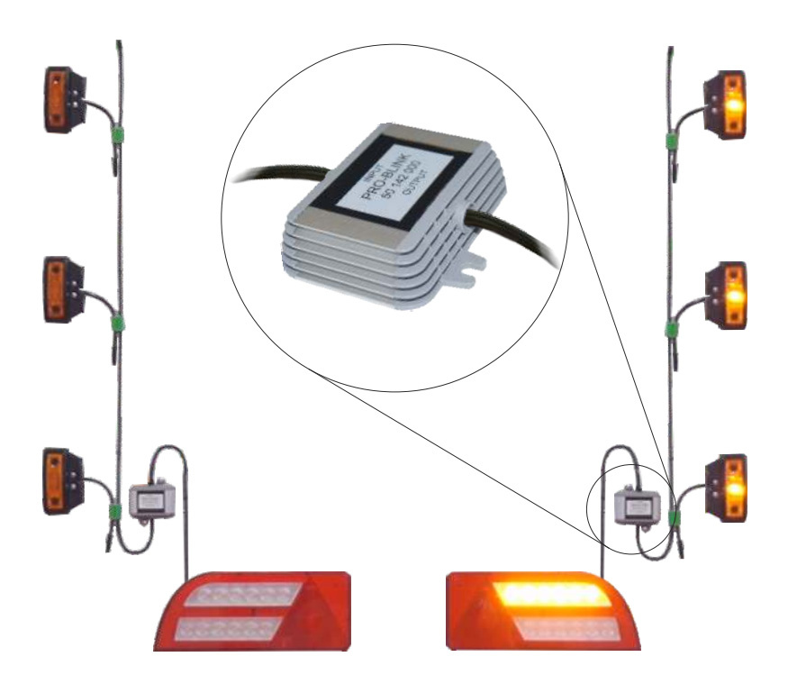 Pro-Blink on sivuvalojen ohjausmoduuli/suuntavilkkurele, jonka avulla äärivalot saadaan vilkkumaan samalla nopeudella kuin ajoneuvon nykyiset suuntavilkut.