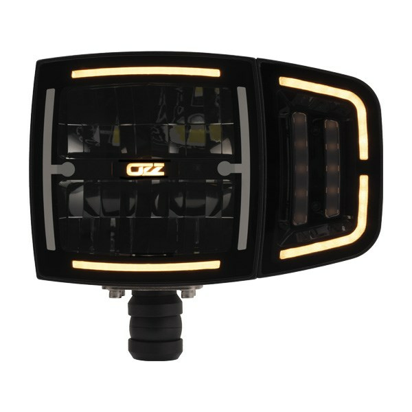 Tehokas LED-valo leveällä valokuviolla. Yhdistää työvalon ja varoitusvilkun yhteen yksikköön. Hyväksytty peruutusvaloksi.